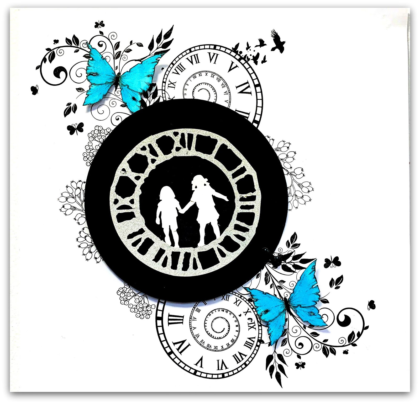 I printed all of the photos in black and white and used a turn and a brad to keep all of the circles in place.